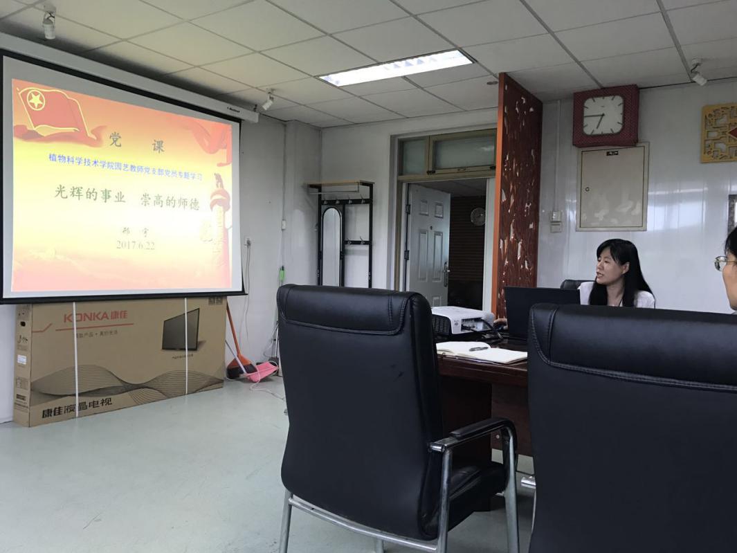 2017年6月22日中午,园艺教师党支部书记邢宇同志在实验楼A座427为支部党员讲党课。党课的题目为“光辉的事业,崇高的师德”,党课共分为四个部分,分别为加强师德师风建设的重要性、党员教师要做教书育人的模范、做“四梦合一”的北农教师及结束语四部分。