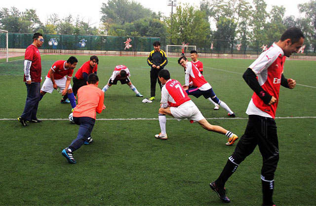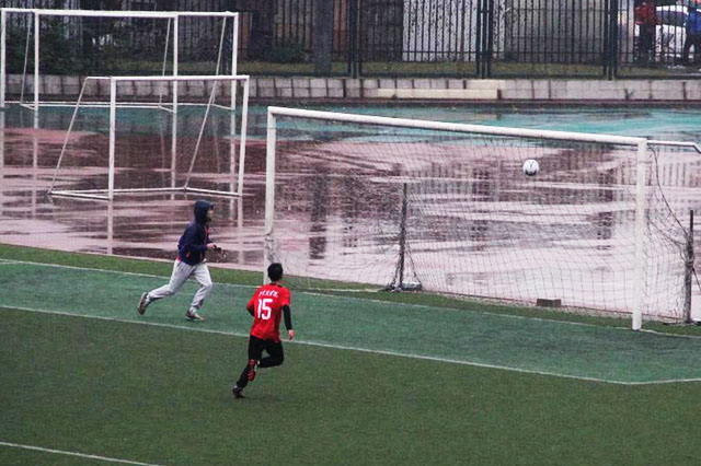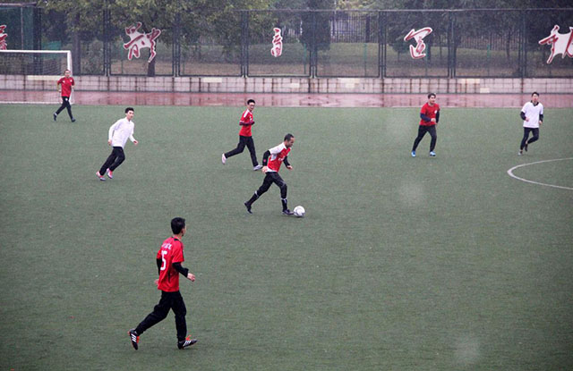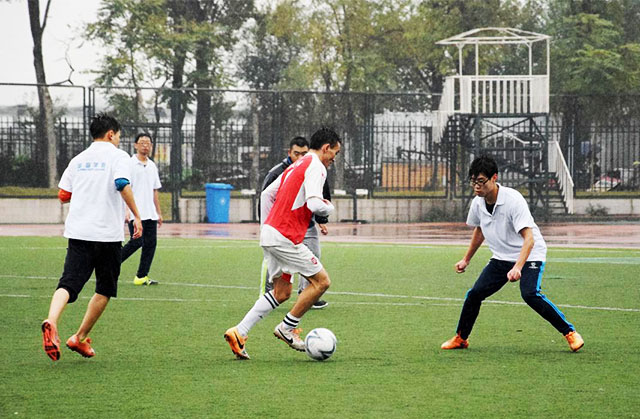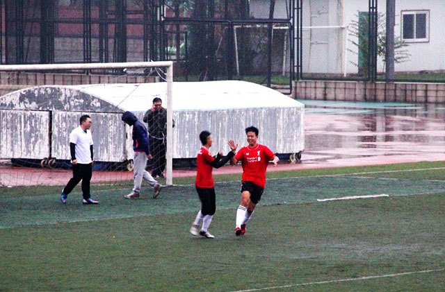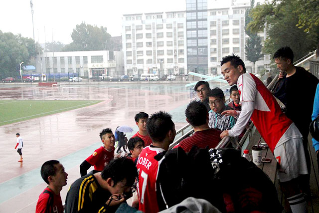 10月27日下午3点30分,BETVICTOR足球队与国际公司足球队在操场上举行了一场足球小组赛。3点左右,运动员们冒着风雨,在满是水洼的球场上开始热身。