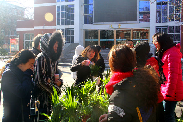 活动摆出的绿植吸引了众多师生,大家都纷纷带着空瓶、废旧电池和旧书来到礼堂门口兑换绿植。即使冬日的空气中透着丝丝寒意,却依旧阻挡不了同学们用废弃物换绿植的高涨热情,大家的脸上都洋溢着开心的笑容。