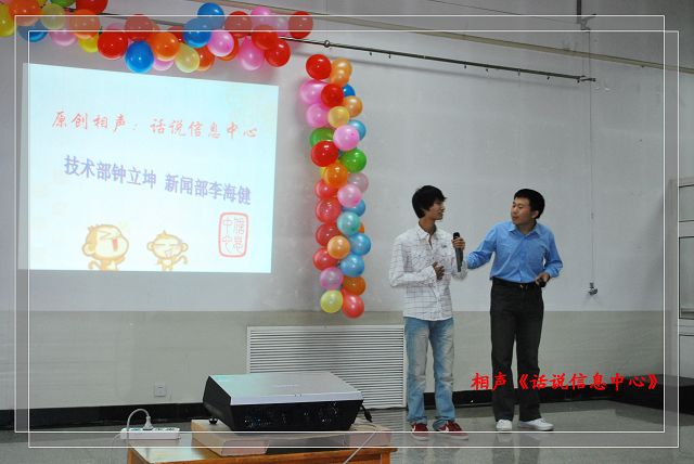 随着六位姑娘们一曲活力四射的舞蹈《撑腰》,庆典活动正式开始。随后钟立坤、李海建的相声表演---《话说信息中心》幽默诙谐的引出由技术部精心打造的《惜今望十》视频回顾专题片,让在座师生直观地了解信息中心一步一步成长的足迹,加上王颖同学的优美配音,让大家如同置身在信息中心走过的岁月中。孙芳菲同学独唱的《最初的梦想》唱出了信息中心全体成员的心声,员工会副主席刘莹带来的《一起走到》,赢得了阵阵掌声,庆典气氛十分活跃,特别是范金娇、陈远客串主持的信息中心保留游戏《指手划脚》,师生们积极参与,配合默契,现场氛围顿时达到高潮。幸运连连串,骆老师、邬老师抽出了在场的六名幸运儿,信息中心指导老师贾慧敏为这几名同学送上了祝福和幸运礼物。
