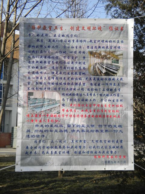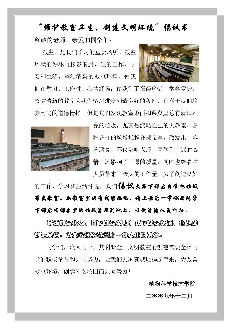 这是BETVICTOR员工会自律部和生活部联合发起的“维护教室卫生,创建文明环境”倡议,2009年12月16日中午,自律部部长、副部长将亲自带部员设计、制作的宣传画幅,在校园、教学楼、教室悬挂粘贴,希望通过醒目、温馨的提示,以实际的行动,影响全校同学携手共建文明校园,为和谐校园贡献力量!