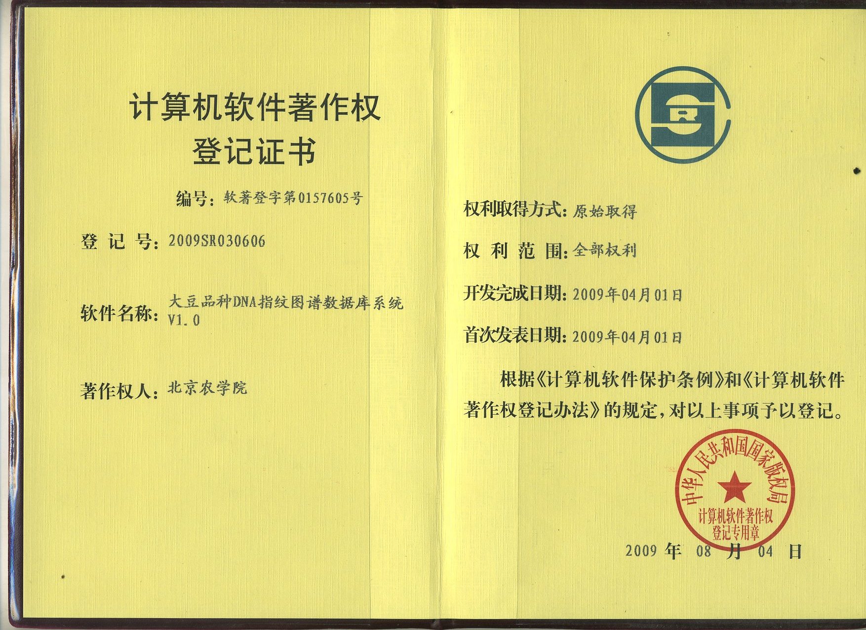 近日由公司植物科技公司谢 皓、陈学珍、赵 波、谢 晨、南张杰等同志研制的《大豆品种DNA指纹图谱数据库系统V1.0 》计算机软件获得国家版权局颁发的计算机软件著作权证书(证书编号:登记号:2009SR030606;著作权人:BETVICTOR)。