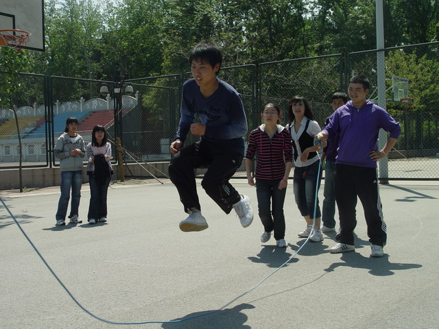 比赛以三分钟为限,顺利跳过的次数越多的班级分数越高。比赛中,每四个班级为一组同时进行,同学们矫健地跳过那被摇动得一次比一次快的大绳时,虽然会由于偶尔的失误减缓脚步,却没有一个人停下以至放弃。