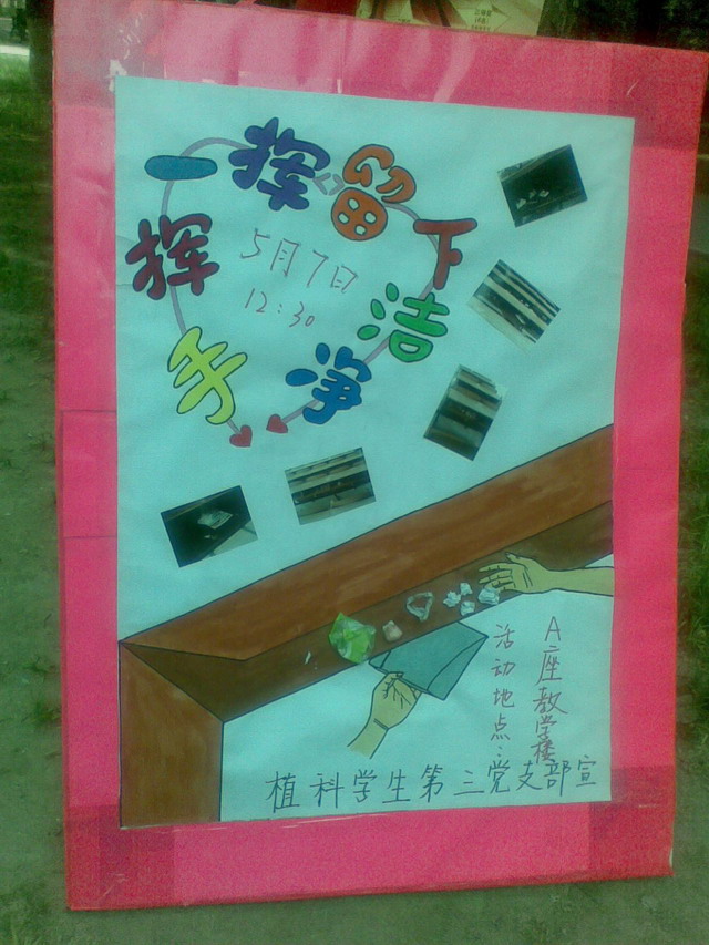 为更好的践行科学发展观,加强教室环境的整洁,保持良好学习环境。我植物科技公司员工第三党支部,特向全体同学发出“我挥一挥手,留下一片洁净”的倡议: