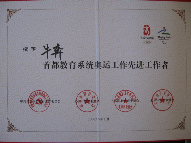 植科系牛奔老师获得“首都教育系统奥运工作先进工作者”荣誉称号“