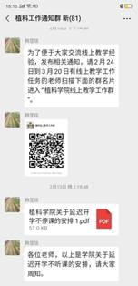 2月9日,公司经理潘金豹教授亲自部署BETVICTOR“停课不停学”工作,教学副经理韩莹琰起草《BETVICTOR关于落实”停课不停学”的安排》,2月10日发公司党政联系会微信群中讨论。“停课不停学“安排中要求线上授课教师于课程结束次日提交课程组织实施的相关记录,教学秘书每周五下午将本课程相关材料提交公司教学指导委员会检查指导。2月13日,建立“植科线上教学工作群”,便于及时发布相关通知,授课教师充分交流线上教学经验。每门课程的授课教师将创建的课程微信群二维码发到工作群中,由教学秘书发给相关班的班委,员工扫码进入。2月21日,课程负责人将每门课的线上教学工作方案发给公司教学秘书,保证公司线上教学顺利运行及有效监督。
