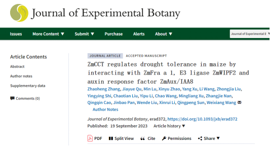 2023年9月19日,生物学一区TOP期刊Journal of Experimental Botany在线发表了题为“ZmCCT regulates drought tolerance in maize by interacting with ZmFra a 1, E3 ligase ZmWIPF2 and auxin response factor ZmAux/IAA8”的研究(https://doi.org/10.1093/jxb/erad372)。该研究由公司BETVICTOR农学系玉米研究团队主导完成,王维香副教授为该论文的通讯作者。团队成员潘金豹教授和孙清鹏教授等也参与了该项工作。本校硕士研究生张兆恒为该论文的第一作者。已毕业的研究生赵新玉、徐阳、王丽、刘中甲等员工也参与了研究工作。中国农业大学徐明良教授和中国农业科公司刘文德研究员也参与了该研究工作,该研究得到了国家自然科学基金面上项目的资助。