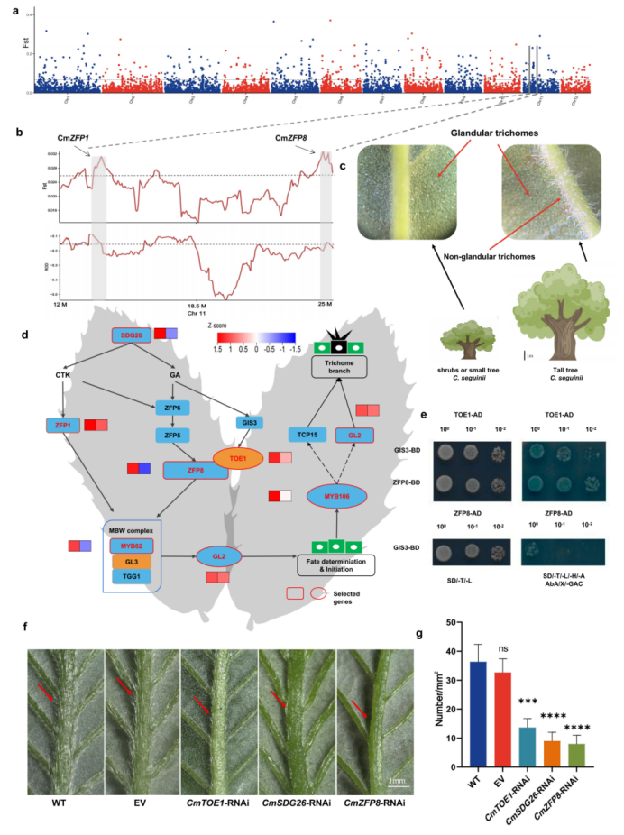 作者还利用SIFT识别全基因组编码区的有害突变特征,明确了有害突变积累增加了栗属植物对各种生物和非生物胁迫环境的遗传负担;利用群体遗传学鉴定了栗类适应不同气候的候选基因,揭示了CmTOE1与CmZFP8和CmGIS3相互作用,促进非腺毛的形成以适应低温和高海拔的分子机制;发现了板栗中CER1基因显著扩增,并验证了CmERF48与CmCER1.6互用通过影响叶片蜡质层厚度进而适应干旱环境的调控机制。综上所述,本研究为栗属植物的进化历史以及气候如何通过自然选择塑造栗属基因组提供了新的见解。