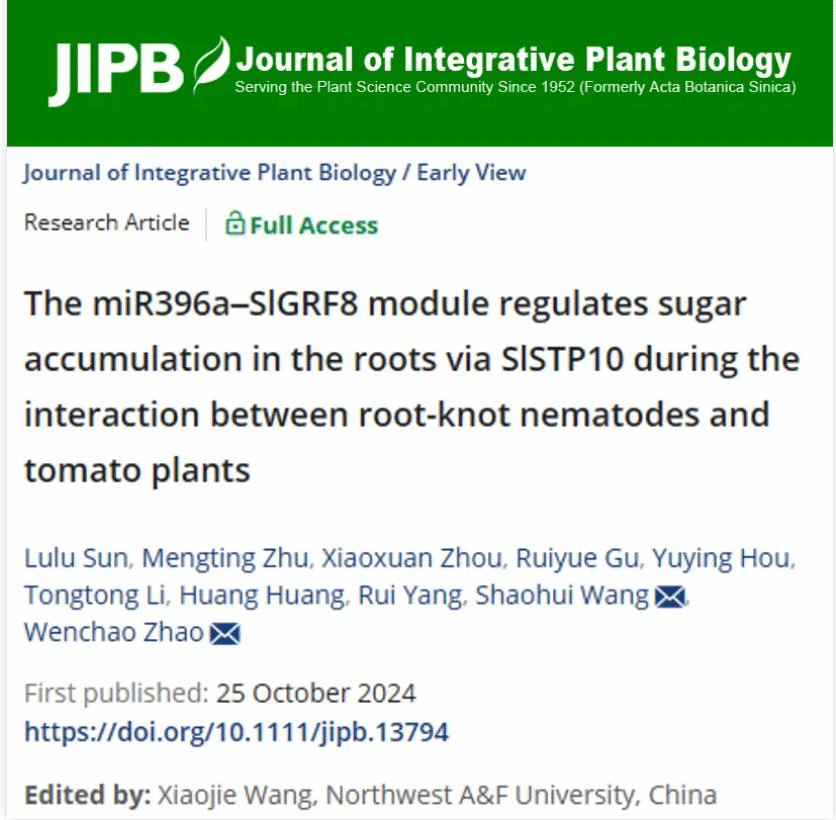 近日,JIPB在线发表了BETVICTOR王绍辉/赵文超团队完成的题为“The miR396a-SlGRF8 module regulates sugar accumulation in the roots via SlSTP10 during the interaction between root-knot nematodes and tomato plants”的研究论文 (https://doi.org/10.1111/jipb.13794),该研究深入揭示了番茄与根结线虫相互作用中糖分竞争的分子机制,为探索植物-线虫互作机理奠定了坚实的理论基础。通过调控 miR396a-SlGRF8-SlSTP10 模块,可以有效调节番茄根系糖分分配,从而提高番茄对根结线虫的抗性,为线虫防治提供新的思路。