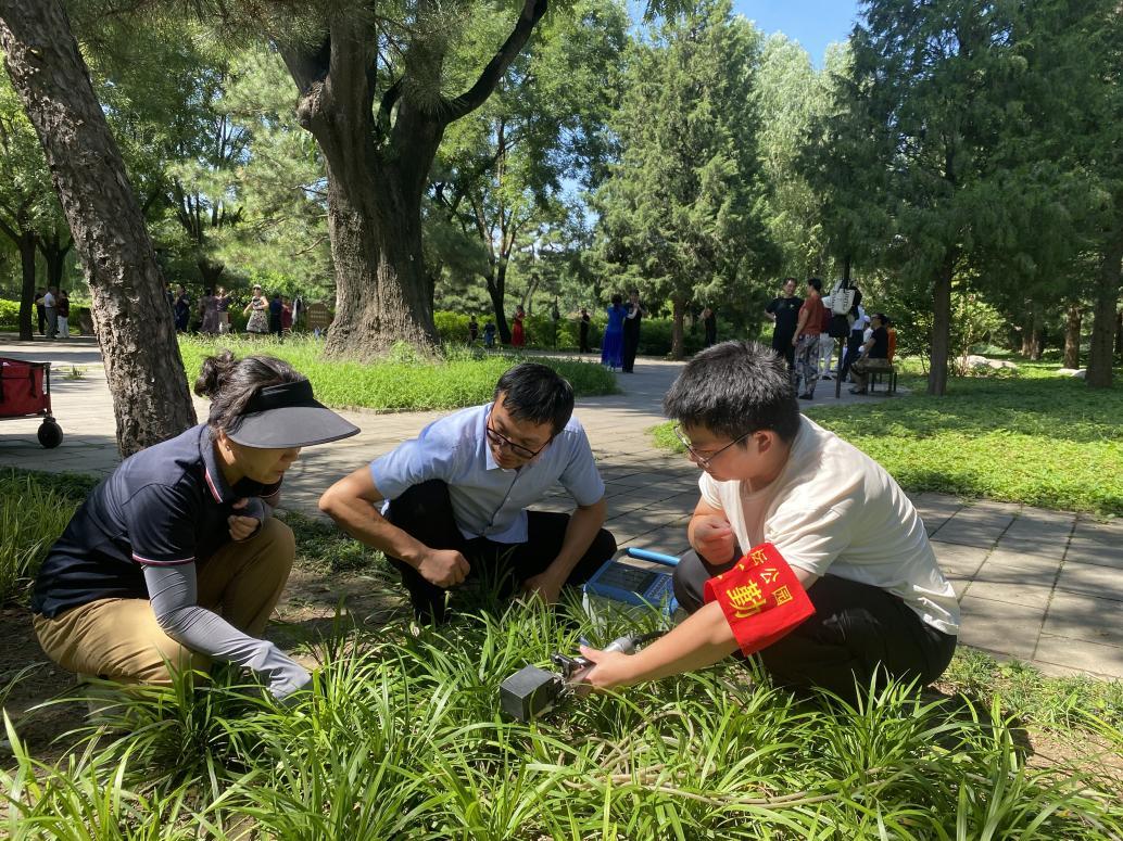 在东城区天坛公园外坛,师生团队深入调研地被植物种植养护情况。通过实地考察,团队发现山麦冬在林下生长良好,在向阳处生长较差,针对此问题,团队提出耐阳品种筛选应用方案,并为公园带来6个特色品种的山麦冬和麦冬种苗,团队党员对各品种的光合能力差异进行了现场测定。
