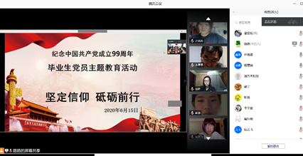 为纪念中国共产党成立99周年,又值2020届毕业生党员即将离开公司,奔赴新的学习工作岗位之即,园艺本科生党支部以纪念和庆祝“七一”党的生日为契机,于6月15日晚7点,以云会议的形式召开了主题党日活动。会议由园艺本科生党支部书记孙路路主持,公司党委书记杨军、公司党总支书记王绍辉、副书记牛奔、组织员谢皓老师、支部全体党员参加了此次会议。