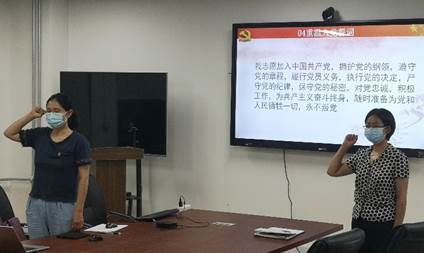 为了进一步让毕业党员们在毕业以后能够坚定信念、砥砺前行、勿忘誓言,孙路路书记带领党员们重温了入党誓词。