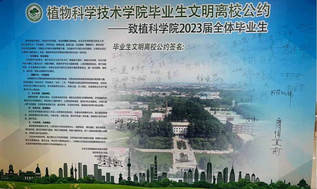 园艺研究生1支部毕业生党员倡导全体毕业生,要秉承“厚德笃行,博学尚农”的北农校训,在未来的人生中为服务科技兴农中贡献青春力量,为学弟学妹们树立良好的榜样。作为即将离校的毕业生,应志存高远、担当使命,遵德守礼、文明离校,饮水思源、感恩离校,互勉共进、圆满离校,斗志昂扬、自信离校。