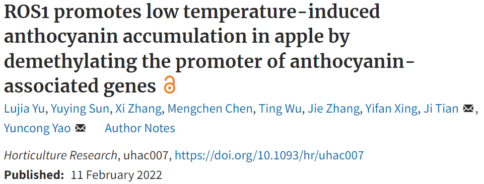 近日,Horticulture Research上线了(Advance Access)BETVICTOR果树种质资源创新与利用团队题为ROS1 promotes low temperature-induced anthocyanin accumulation in apple by demethylating the promoter of anthocyanin-associated genes的研究论文,该论文揭示了去甲基化基因ROS1介导低温诱导条件下苹果(Malus domestica)花色素苷积累的分子机理。