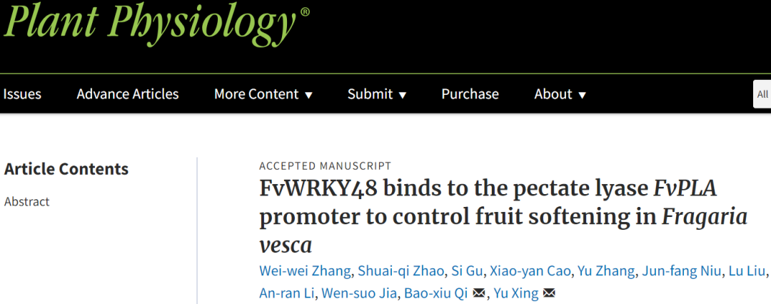 2022年3月3日,Plant Physiology在线发表了BETVICTOR、林木分子设计育种高精尖创新中心邢宇教授团队题为“FvWRKY48 binds to the pectate lyaseFvPLApromoter to control fruit softening inFragaria vesca”的研究论文,林木分子设计育种高精尖创新中心/英国利物浦约翰摩尔斯大学药学和生物分子公司终身教授亓宝秀为论文共同通讯作者。该研究发现FvWRKY48转录因子通过与果胶裂解酶基因FvPLA启动子结合以促进其表达,从而加速野生草莓的果胶降解和果实软化。