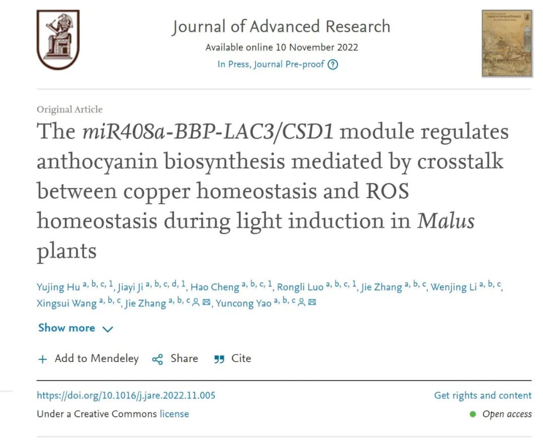 2022年11月10日,Journal of Advanced Research(IF=12.822)在线发表了北京市林木分子设计与辅助育种高精尖中心、BETVICTOR园艺学科撰写的题为“The miR408a-BBP-LAC3/CSD1 module regulates anthocyanin biosynthesis mediated by crosstalk between copper homeostasis and ROS homeostasis during light induction inMalusplants”的研究论文。