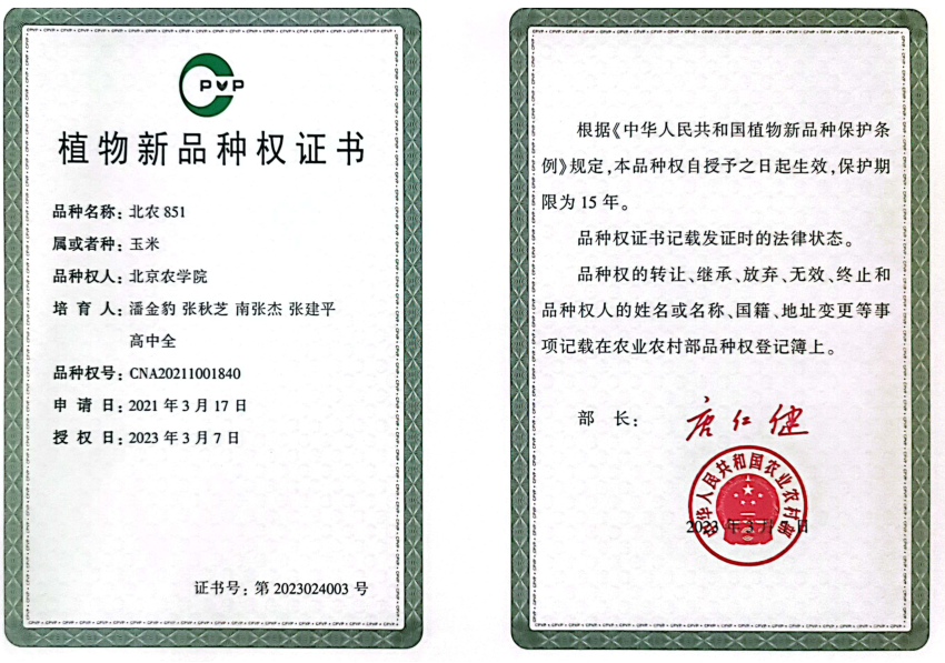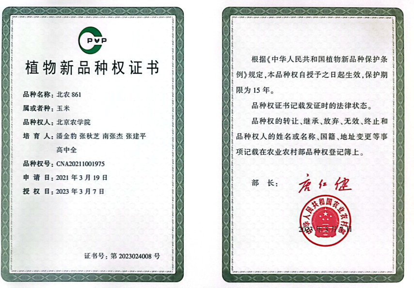 喜讯:BETVICTOR青贮玉米团队:潘金豹、张秋芝、南张杰、张建平、高中全培育的玉米品种北农851 、北农861 取得国家植物新品种权证书。