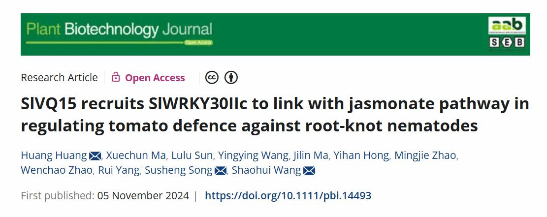 公司王绍辉/赵文超教授团队揭示SlVQ15招募SlWRKY30IIc偶联茉莉素途径调控番茄响应根结线虫入侵的分子机制