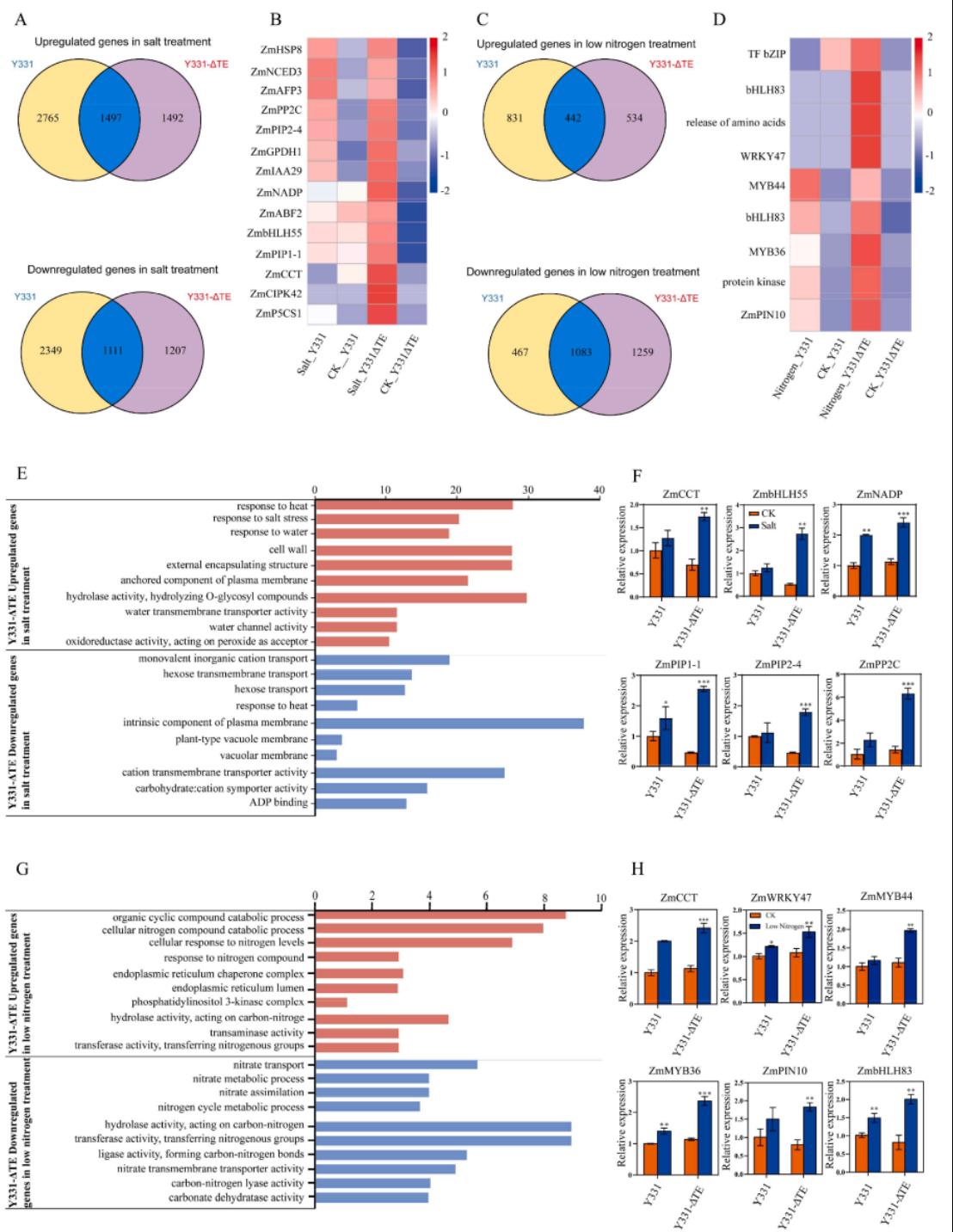 玉米(Zea Mays L.)是重要的粮食作物、饲料来源以及工业原料[1,2]。近些年极端天气的频繁出现,使玉米在生长过程中受到高/低温、干旱、涝害、盐害以及病原菌入侵等 多种不确定因素的胁迫。非生物胁迫(如干旱、盐碱与低氮)显著抑制玉米生长发育并导致减产。前期研究中,王维香教授课题组和中国农业大学徐明良教授合作,成功克隆了玉米转录因子基因ZmCCT,并揭示其通过光周期途径调控开花时间;同时发现ZmCCT启动子区的转座子(TE)插入会降低玉米茎腐病抗性。然而,ZmCCT响应生物与非生物胁迫的分子机制尚未明晰。在该研究中,王维香教授团队利用Y331/Y331-ΔTE自交系和83B28H1/H1/83B28H5/H5单倍型,证明了ZmCCT在玉米耐盐和耐低氮胁迫中发挥重要作用。通过DAB染色和H2O2含量分析,证实了Y331-ΔTE和83B28H5/H5在高盐和低氮处理后表现出更小的膜系统损伤和更高的胁迫耐受性。并且在高盐和低氮胁迫条件下,与Y331和83B28H1/H1系相比,Y331-ΔTE和83B28H5/H5自交系表现出更优越的表型表现。此外,与野生型植株相比,过表达ZmCCT的转基因拟南芥对盐和低氮胁迫的耐受性增强。此外,RNA-Seq分析表明,ZmCCT在应对高盐和低氮耐受性时,可直接激活这些盐诱导基因ZmNADP、ZmPP2C、ZmbHLH55、ZmPIP1–1、ZmPIP2–4,以及一些低氮相关基因ZmWRKY47、ZmMYB44、ZmMYB36、ZmPIN10和ZmbHLH83。综上所述,其研究结果表明ZmCCT在高盐和低氮胁迫耐受性中发挥重要作用,并进一步证明了ZmCCT具有多种非生物胁迫作用。这些结果表明,ZmCCT可能是玉米分子设计育种中增强植物耐盐和耐低氮胁迫的潜在候选基因。