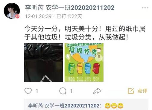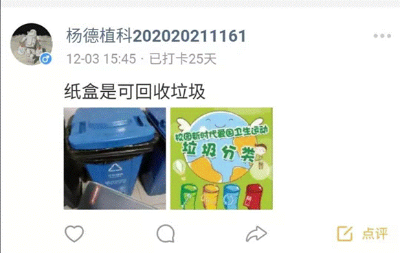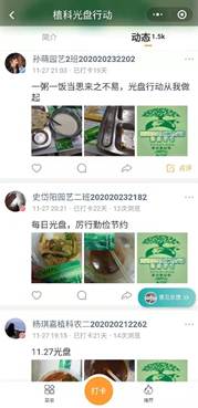 活动期间同学们的打卡热情十分高涨,都踊跃晒出自己的光盘照片与垃圾分类照片并且每一次打卡都配有心得体会。