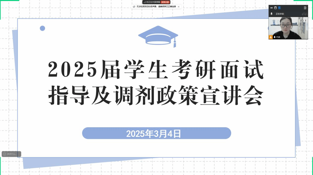 贾慧敏结合往年调剂时间、基本情况对今年的形势进行了全面的分析,并带领同学们详细解读了调剂的基本要求、流程以及相关时间节点,为同学们提供了如何筛选合适院校、如何提交调剂申请等实用的调剂建议,并鼓励同学们保持积极心态,拓宽信息渠道,把握每一个可能的调剂机会。