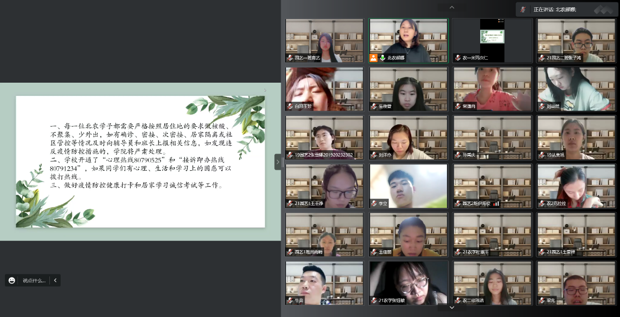 研究生辅导员贾慧敏对校内外生研究生给予了鼓励,在疫情防控特殊时期希望同学们释放情绪、缓解心理压力。公司创办开通心理热线,接诉即办热线,为大家解决实际困难。大家思想和行动要统一起来,为公司疫情防控和返校学习工作助力。